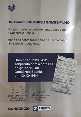 Sr. Daniel de Abreu Gomes Filho, chegando em Maringá-Pr em meados de 1984, juntamente com seus familiares e o seu SCANIA 111-S, ano 1980, onde muito trabalho e dedição sempre foram o foco desse empreendedor que no final de 1984, foi contemplado por um consórcio SCANIA, já adquirido em anos anteriores, conseguiu conquistar o seu primeiro Scania T-112, ano 1984, zero km, que hoje faz parte da frota, veículo sendo o frota 001.